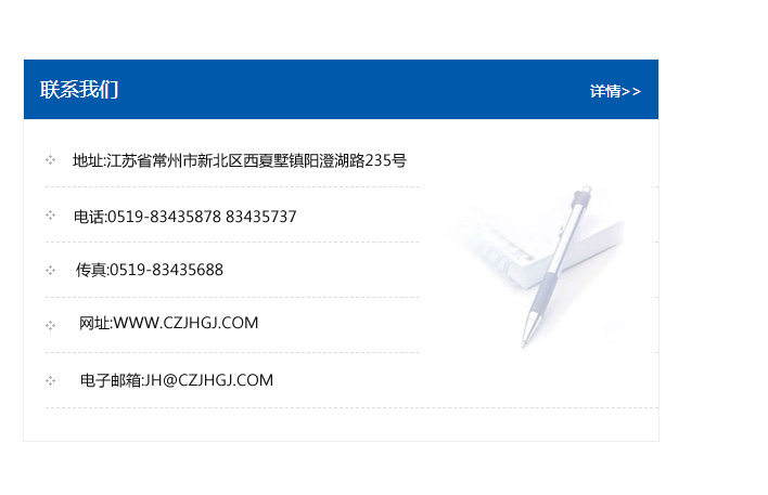 地址:常州市新北區友邦商務大廈1幢16、17層  電話:0519-85101652  傳真:0519-85112595  郵編:213022  網址:www.cz-jiayue_cn.xinwanbaihuo.com  郵箱:xiajifengaa@163.com